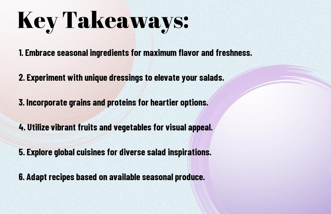 As you explore the world of salads, you’ll discover a vast array of ingredients and flavors to suit your taste. You can enjoy a fresh salad in any season, and with a little creativity, your meals can be exciting and healthy. You’ll find inspiration in these unique recipes, tailored to each time of year, to elevate your salad game and make the most of your favorite ingredients. Your salad creations will never be boring again with these innovative ideas.