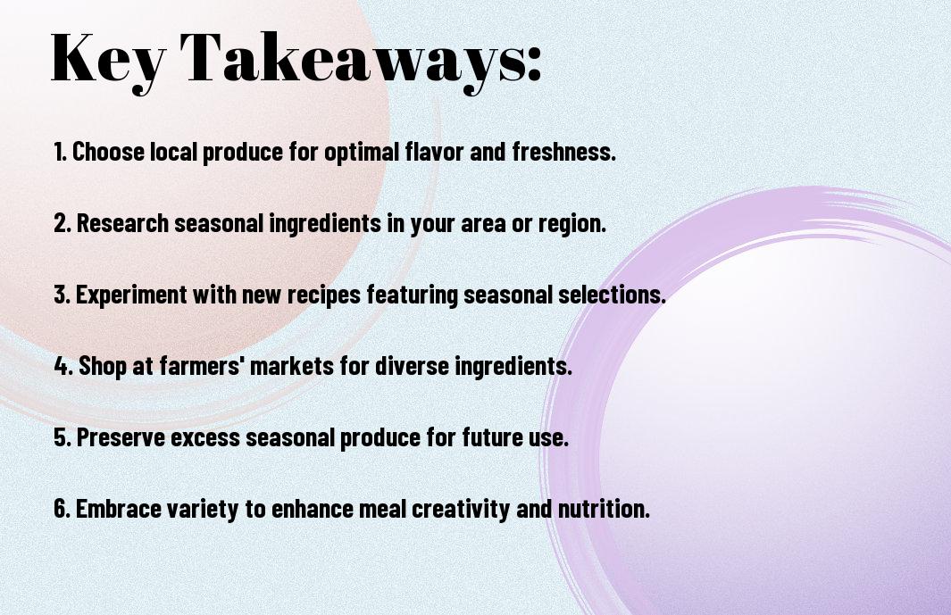 Considering all points, you now have a solid foundation for cooking with seasonal ingredients. You can elevate your dishes by incorporating fresh, locally sourced produce into your recipes. By doing so, you will not only enjoy better flavors, but also support your local community and reduce your environmental impact. Your cooking will become more vibrant and dynamic, as you experiment with the unique flavors of each season.
